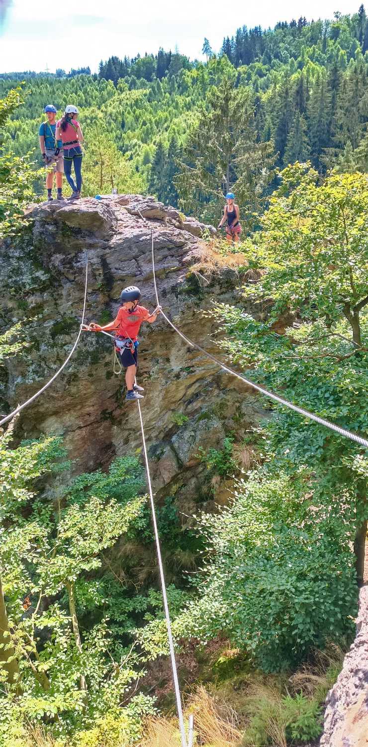 Ponieważ jesteśmy już w Czechach to wybrałem miejsce najbliższe aby nie jeździć za dużo. Miejscowość Semily via ferraty na Wodnej Bramie nad Izerą. Miejscowość położona zaledwie 35 km od naszej granicy. Via Ferrata to nic innego jak ubezpieczony szlak, po którym poruszamy się po stalowych linach, kładkach, klamrach przy użyciu takiego sprzętu jak kask, uprząż wspinaczkowa oraz lonża z obsorberem. Coś jak park linowy tylko na skale.