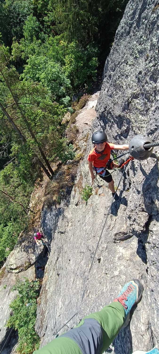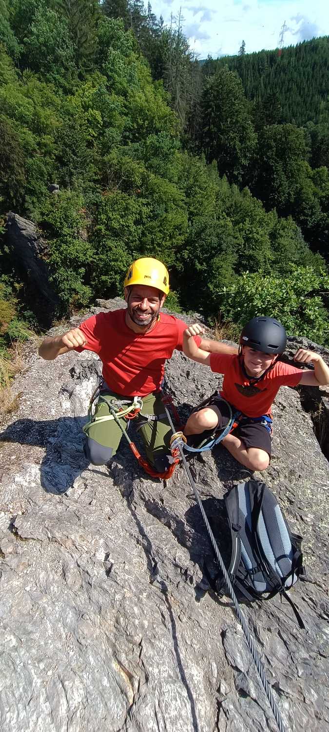 Szybkie przypomnienie zasad obsługi sprzętu i ciśniemy. Patrząc na banana na twarzy młodego wiedziałem, że to jest to – moja krew, genów nie zmienisz. Jak sam stwierdził lekki stresik jest ale warto. Siekamy wszystkie dostępne warianty łącznie z D+/E, na której musiałem Stasia asekurować w trudniejszych momentach, ale jak to stwierdził jeden z Czechów rozmawiając ze Stasiem na szczycie…”popracujesz nad wytrzymałością i jak w tym miejscu spotkamy się za rok nie będziesz potrzebował pomocy”…