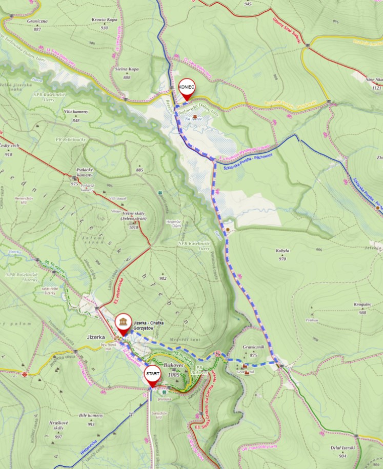 Szlak z Jizerki do Chatki Górzystów najlepiej rozpocząć z dużego parkingu Pod Bukowcem na początku osady, przy pensjonacie Hospoda na Jizerce. Parking kosztuje kilka koron i jest to opłata jednorazowa rzędu około 10 zł za dobę. Z tego miejsca kierujemy się szlakiem czerwonym albo na północny wschód obchodząc Bukowiec (1005 m n.p.m.) z prawej strony i przechodząc później na szlak zielony, albo bardziej w kierunku północnym idąc wprost do Jizerki. My wybraliśmy tę drugą opcje po pierwsze, że chcieliśmy zobaczyć Jizerkę po drugie szlak obchodzący Bukowiec z prawej strony był w remoncie.