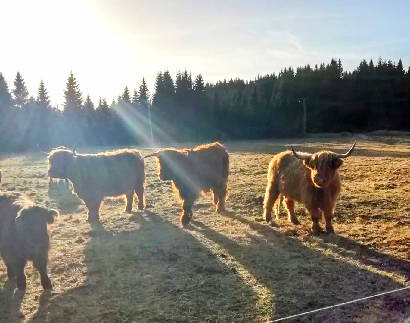 Kierujemy się wiec szlakiem czerwonym (drogą asfaltową) do centrum osady. Droga biegnie łagodnie w dół po drodze mijamy szlak (zielony), którym możemy wejść na Bukowiec. Na pierwszy plan po wejściu do osady uwagę przykuwa Pyramida, w której obecnie jest restauracja i pensjonat. Budynek ten jest pozostałością po dawnej szlifierni szkła. Pod koniec XIX w przekształcono go w zajazd i podobną role pełni po dziś dzień. Kolejną uwagę przykuwa Pansky Dum, który został wybudowany w 1829r wraz z hutami szkła. Idąc dalej po lewej stronie od budynku na pastwiskach często pasą się krowy górskie jest to szkocka rasa bydła rasy rustycznej takie pomieszanie bawoła z żubrem. Zwierzęta te robią niesamowite wrażenie na tle tutejszego krajobrazu. Od razu zaznaczam nie zawsze są wypasane.