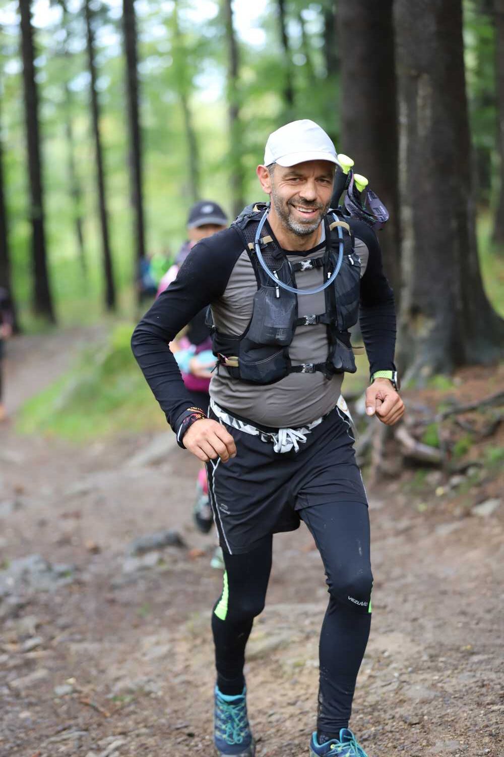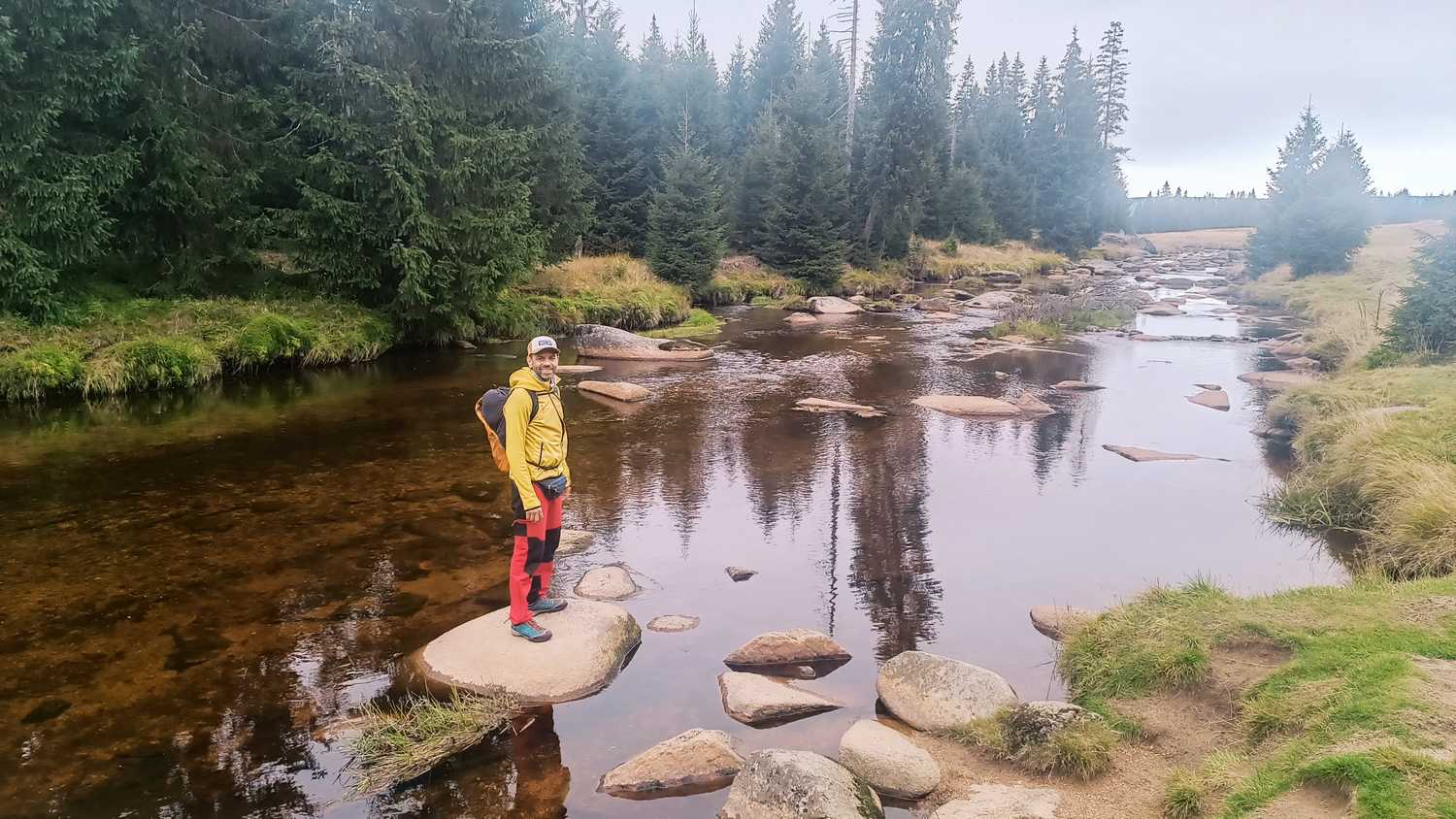 Zielonym szlakiem pomykamy w kierunku schroniska Orle po drodze mijając oddany w 2022r nowy mostek nad rzeką Izera. Dalej szlakiem czerwonym docieramy do Chatki Górzystów na wymarzone naleśniki …. pycha (pełen opis szlaku znajdziecie tu). Rozpadało się co zdecydowanie zagęściło atmosferę w schronisku gdyż wszyscy zaczęli się pchać do środka. Czas wracać. Pogoda zmusił nas do powrotu tym samym szlakiem, bo nie było sensu tłuc się po lasach w taką ulewę, w końcu miała to być tylko rozgrzewka przed jutrzejszym dniem. I tak od niechcenia pykneło 21km. Góry te mają swoją niepowtarzalną magię. Spokój emanujący z połonin, powiew wiatru szeleszczący wśród drzew. Mgła podnosząca się znad rzeki czy parujący po deszczu las sprawiają, że człowiek zwalnia. Galopujące myśli w codziennym wyścigu szczurów odchodzą na drugi plan a główną narrację przejmuje otaczająca nas przyroda. Brak dużych przewyższeń i łagodność szlaków zwiększają znacznie dostępność tego obszaru dla każdego kto tylko zapragnie na chwilę oderwać się od codzienności bez nadmiernego katowania organizmu. Co dziwne można tu nadal spotkać zdecydowanie mniej ludzi niż w pobliskich Karkonoszach.