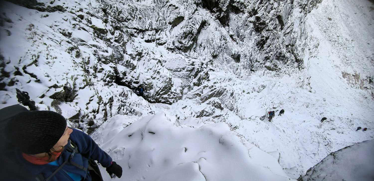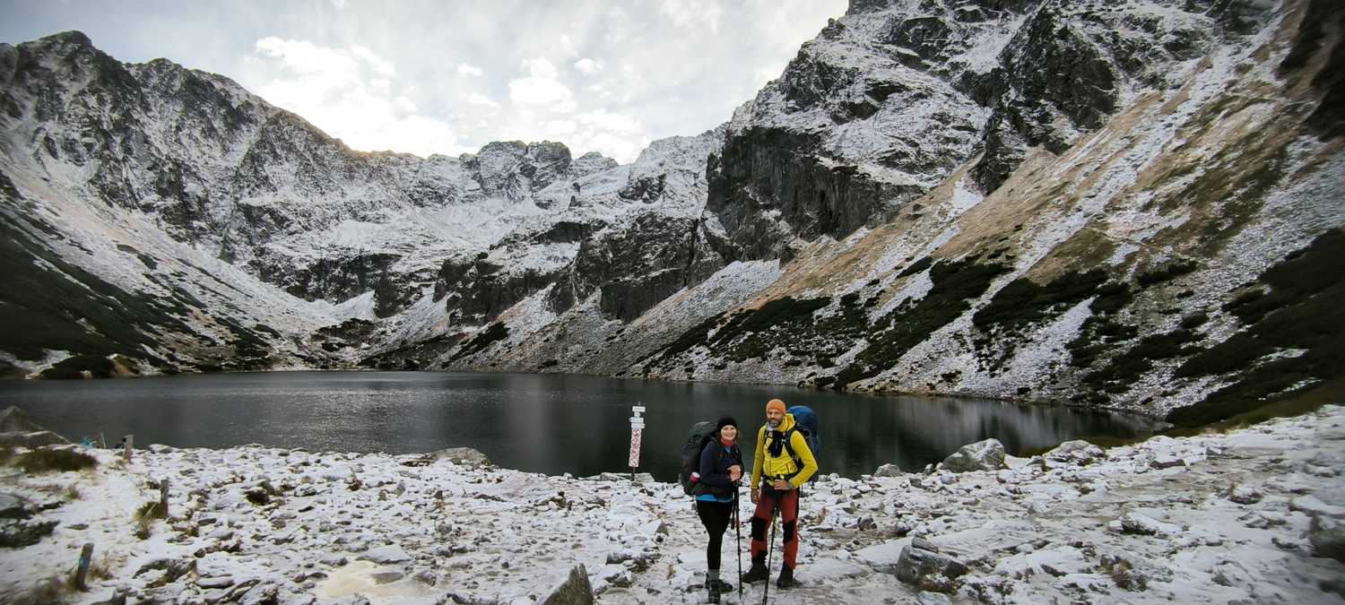 Jest walka, na łańcuchach niektóre sekwencje w lodzie są trudne, do tego ekspozycja podnosi tętno. Kilka krotnie asekuruję Basię, ale widać, że obydwoje walczą dzielnie. 150 metrów w pionie zajmuje nam około 40 minut, dochodzimy do przełęczy na Zawracie … uff udało się. Nagrodą jest wspaniała panorama Tatr wysokich i ciepła herbata z termosu. Zejście do Pięciu Stawów jest łagodne a raczki świetnie zdają egzamin. Wyprzedzamy kilku turystów niedostatecznie przygotowanych i walczących o życie na każdym kroku aby nie fiknąć orła.