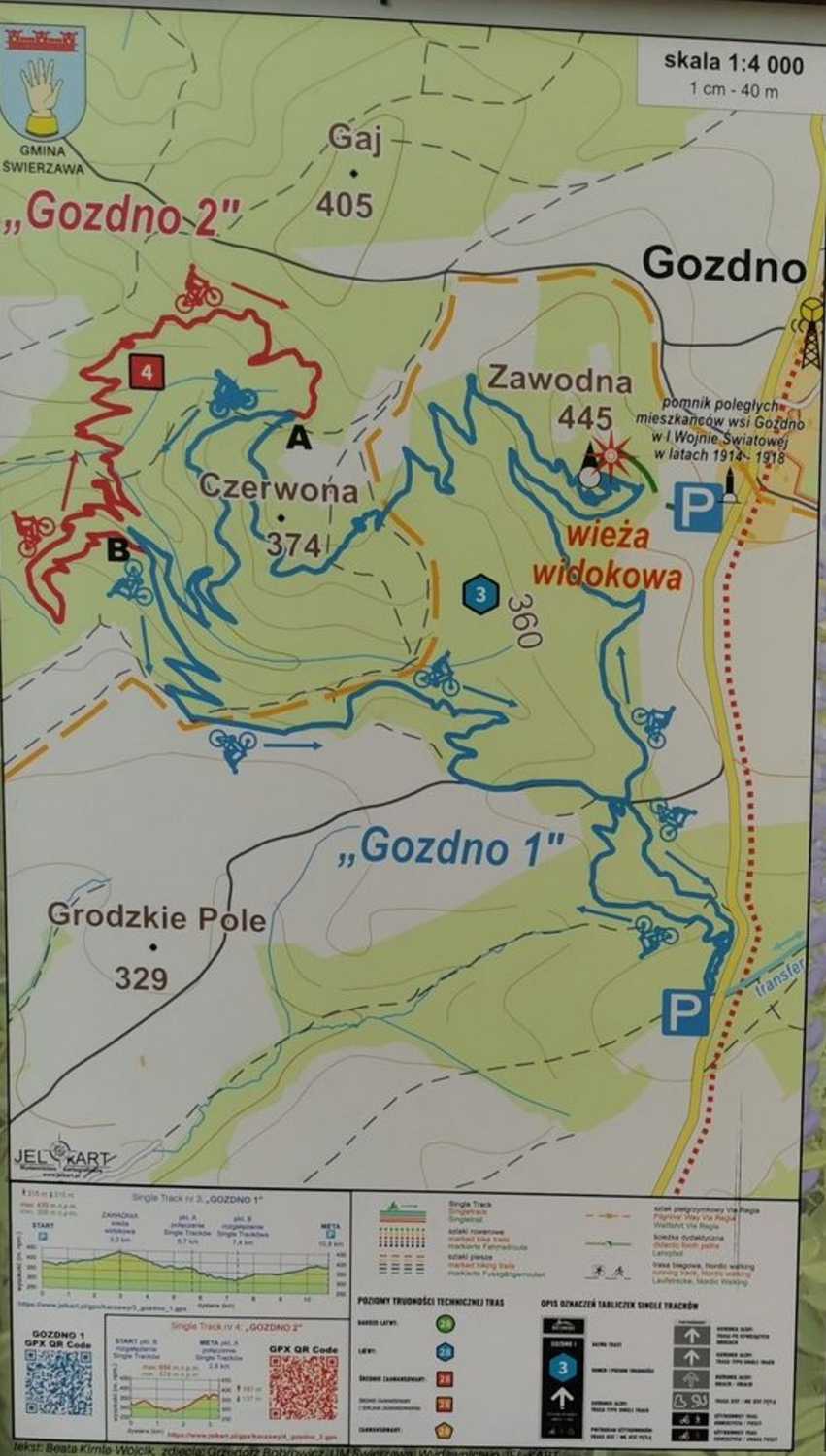 Trasa Gozdno 1 nie należy do trudnych, 3 km podjazdu i jesteśmy na szczycie. Przerwa na foty z wieży i następnie zjazd z dużą dawką emocji i zabawy. Czekają na nas tu liczne ostre zakręty i bandy i choć nie są one trudne technicznie należy zachować na nich szczególną ostrożność. Gozdno 1 łączy się na niecałe 4 km przed końcem z Gozdno 2, zdecydowanie trudniejszą pętlą. I tu info dla zainteresowanych – trudniejsze nie znaczy szybsze i bardziej niebezpieczne, tylko w tym przypadku dłużej i ciężej dymasz pod górę. Dziecko napędzane snickersami da radę, ale nie gwarantuje, że jeszcze gdzieś z nami pojedzie. My daliśmy radę i łącznie machnęliśmy 15,5 km.
