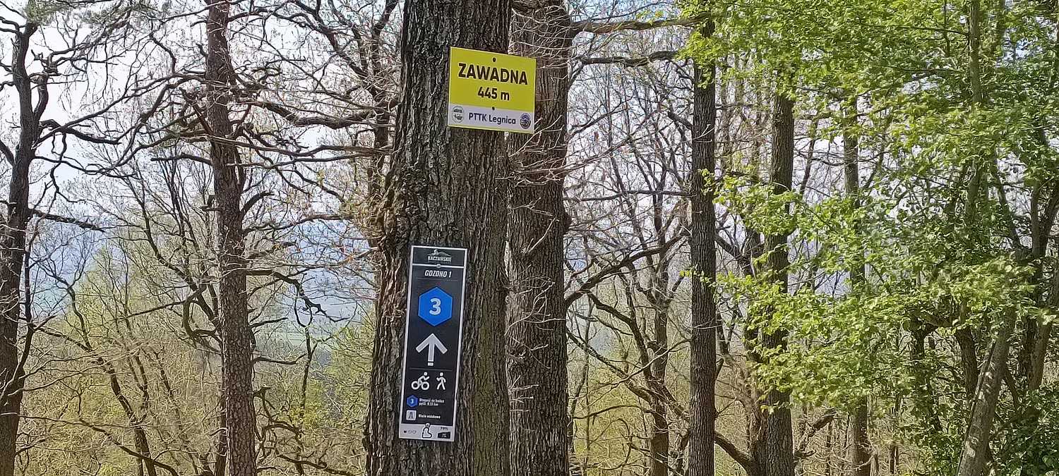 Na start wybrałem miejscowość Gozdno i trasa o tej samej nazwie z super wieżą widokową na szczycie Zawadnej 445 m n.p.m. Moim zdaniem z tej wieży jest najlepszy widok na Kaczawy, Rudawy i Karkonosze, o tej porze jeszcze pokryte śniegiem.