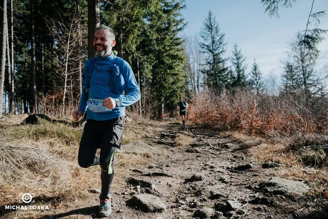 Wybiegam na szlak i staram się utrzymać równe tempo aby wyrównać oddech. Czas się rozebrać bo czuje, że się gotuję we własnym sosie. Kurde miało być zimno, szron na brodzie, śnieg, a tu kremik i okularki. W marszu ściągam bluzę i błogi wiaterek osusza spocone ciało. Tak to można dreptać, pocieszam się w duchu. Wciągam żela i już bez wymówek do przodu. Kilometry lecą, czuje że jest dobrze jak na tak małe przygotowanie z mojej strony. Decyzję o starcie podjąłem trzy tygodnie temu zupełnie na spontanie. Jest to mój debiut w zimowych biegach i szczerze liczyłem na zimowe warunki. Jeszcze 20 dni temu były wspaniałe warunki śniegowe na Zimowym Półmaratonie Gór Stołowych, który zainspirował mnie do startu, a tu niestety pogoda spłatała figla.
