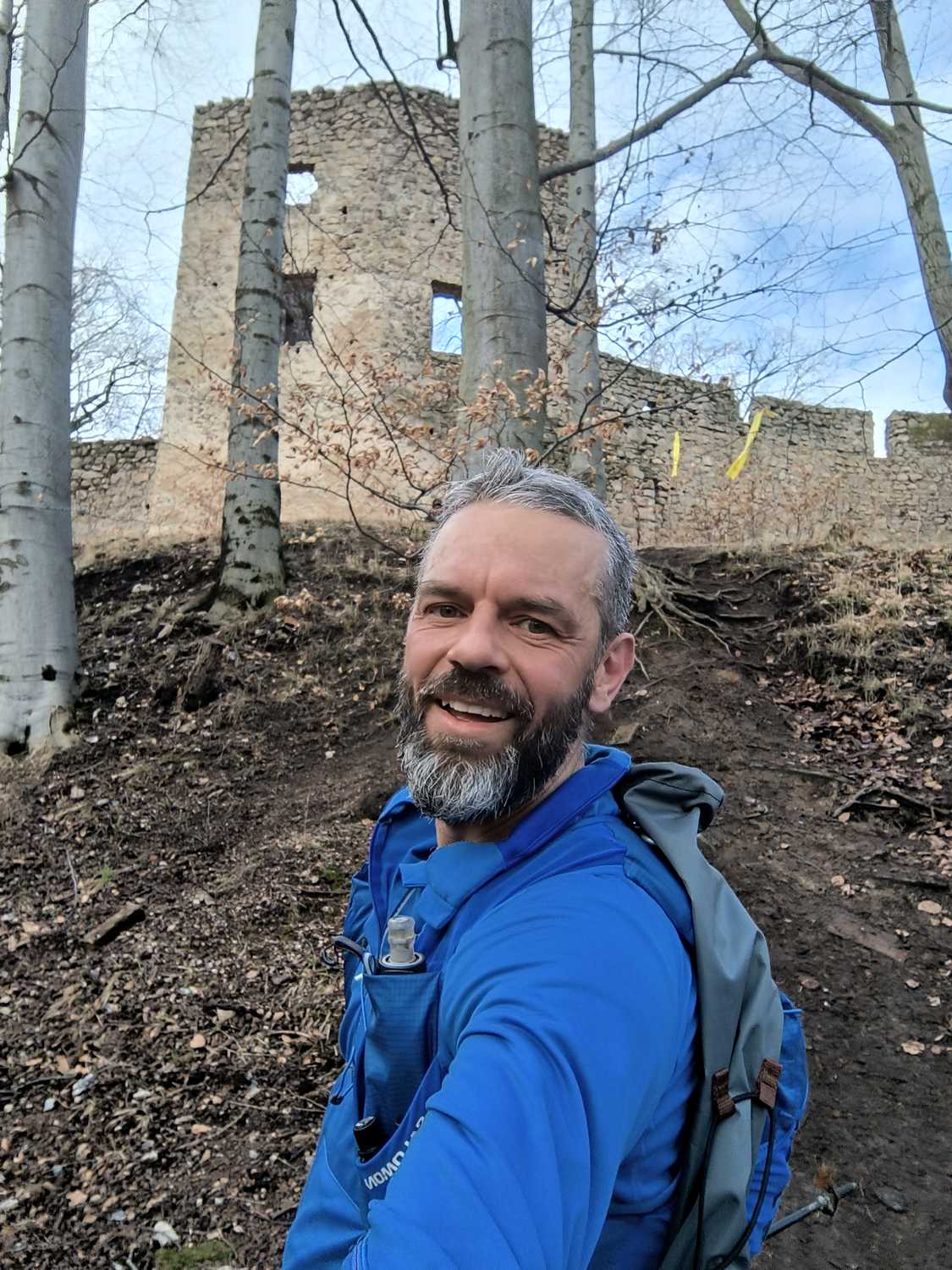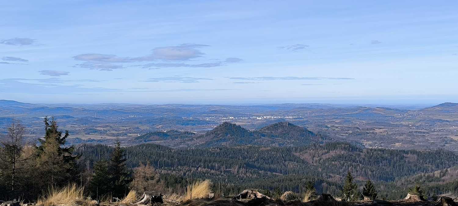 Na 9 kilometrze dobiegam do Zamku Bolczów trasa prowadzi przez barbakan i dalej drogą zamkową przez Miedziane Skały do kolejnego już ostatniego punktu żywieniowego przy polanie Mniszkowej. Miła obsługa zachęca do skosztowania specjałów. Łykam izo, dwa banany w rękę i pędem w kierunku szczytu Wołek (878 m n.p.m.). Strome podejście na krechę w górę daje się we znaki. To najwyższe wzniesienie na trasie. Wyciągam telefon i pykam fotkę pięknej panoramy z jak to niektórzy nazywają „cyckami Maryny” w tle (Krzyżna i Sokolik). Patrzę na numer startowy i wyrysowany na nim profil trasy. Z zegarka wynika, że jestem na 13 km teraz już raczej w dół, trzeba cisnąć, zostało 8km. To jest ten moment kiedy trzeba nadrabiać straty złapane na podejściach. Znowu żelik zwijam kije i w dół w kierunku Starościańskich Skał. Szutrowym duktem biegnie się pięknie równy oddech wyznacza tempo. Jacyś turyści spoglądają na mnie z niedowierzaniem walcząc z oddechem na podejściu w przeciwnym kierunku.