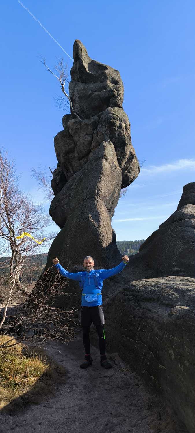 Z pięknego szutrowego duktu tasiemki wskazujące drogę kierują w las. O zgrozo błoto, koleiny, bagno, strumień płynący środkiem. Odstawiam jakieś niestworzone figury aby nie wpaść po kolana. Doganiam grupkę biegaczy, których zdecydowanie mocniej spowolnił ten tor przeszkód. Skręt w lewo pod górę. Słyszę charakterystyczny odgłos owczego dzwonka. Jeden z organizatorów stoi na podbiegu machając dzwonkiem krzyczy „… dalej, dalej, dalej, jeszcze parę metrów i starościańskie a potem 4km w dół…”. Jakbym dostał skrzydeł, wyprzedzam całą grupkę i podbiegam pod skałę, a tam pionowo pod górę, prawie wspinaczka między skałami pod sam szczyt Lwiej Góry (718 m n.p.m.). Pamiątkowa fota i ciasnymi slalomami pomiędzy skałami w dół do podstawy ściany. Wybiegam na już dobrze znany szutrowy dukt. Ostatni żelik przechodzi gładko przez gardło popity sporą ilością płynu. Teraz już się nie ma co oszczędzać.
