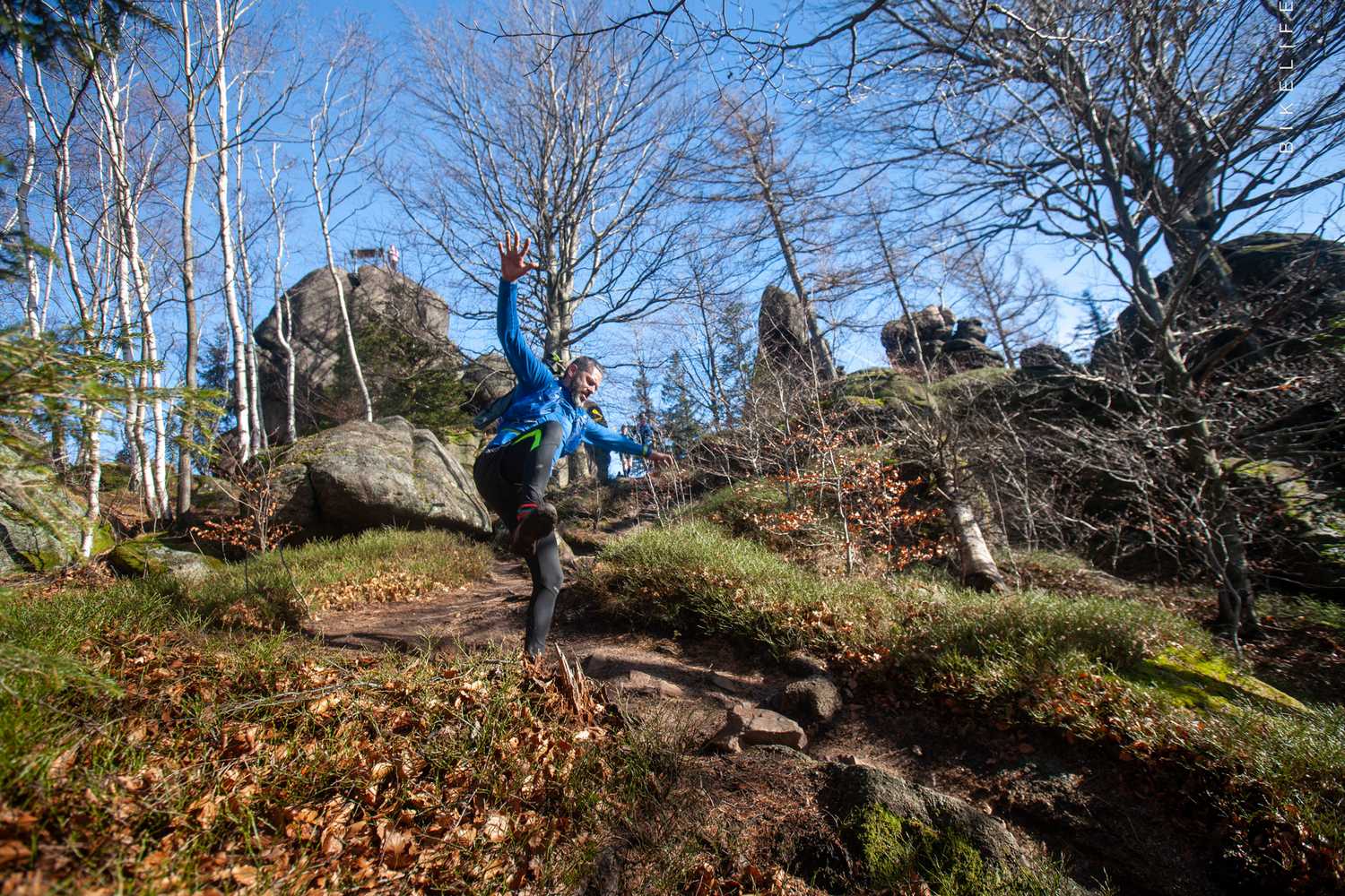 Pognali niczym zerwany z łańcucha pies za listonoszem. Jedni centralnie środkiem wymachując rękoma aby utrzymać równowagę, inni bokiem, krawędzią błotnistej rynny, byle w dół, do szlaku. Nie jeden zaliczył „dupo-ślizga” przybierając już na początku wojenne barwy. Wybiegam na szutrową drogę trawersującą wokół Sokolika (643 m n.p.m.). Już po pierwszych 500 metrach wiedziałem, że ubrałem się za ciepło, choć temperatura około 7 stopni to poziom adrenaliny zdecydowanie zwiększał odczuwalne wartości. Cały czas w duchu powtarzam sobie nie za ostro, powoli rozbujaj silnik. Tętno wraca do przyzwoitych wartości tuż przed pierwszym podbiegiem. Organizatorzy zadbali o to aby na samym początku ładnie rozbić peleton. Kto nie poległ na zbiegu to z pewnością zapłacze na pierwszej górce (Sokolik) a jak mu za mało to już na pewno przyklęknie na drugiej, parę set metrów dalej (Krzyżna Góra 653 m n.p.m.). Spoglądam na zegarek 1,8 km a wiec pierwsza „kiepka” start. Stromy techniczny podbieg długości około 0,7km i w pionie 160m. Niby nic ale patrząc, że to rozgrzewka (minęło dopiero 10 minut) i w tętnie 175 uderzeń to jak tak daje pójdzie silnik się zatrze. Dwa większe wdechy i „dzida” w dół. Stromo ale szeroko, but dobrze trzyma szutrowe podłoże wiec można się w marę rozpędzić. Po drodze dużo kibiców, zachęcających do podkręcenia tempa z uśmiechem na twarzy krzycząc …świeży jesteś, dajesz. Pod szczyt Krzyżnej dobiegam już w towarzystwie kilku osób. Ostry stromy, prawie pionowy zbieg rozbija peleton do reszty. Ci mocniejsi są już pewnie na podbiegu pod Janowickie Garby a ja docieram dopiero na pierwszy punkt żywieniowy zlokalizowany przy schronisku Szwajcarka 4,5km od startu. Dolewam izo i kolejny raz zbiegam błotnistą rynną.