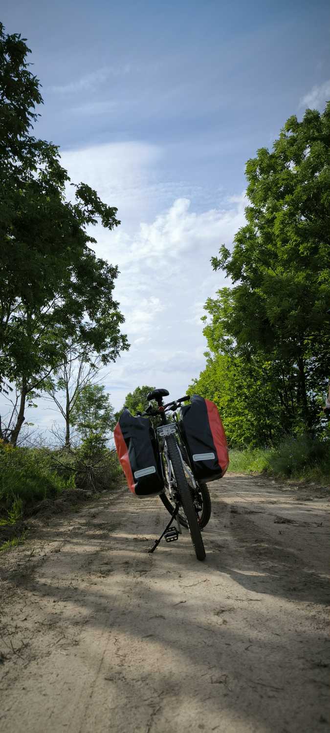 Docieramy do Białogardu 104 km na liczniku i jeszcze tylko 12 km do noclegu. Zatrzymujemy się w McDonald’s na szybką toaletę. Spotykamy znajomych z odcinka pomiędzy Złocieńcem a Połczynem. Opierając się o sakwy zauważyłem, że zgubiłem śrubę mocującą jeden z widelców bagażnika. Sakwy ważą swoje i brak śruby może spowodować zerwanie bagażnika. Kombinuję co tu zrobić. Na szczęście okazuje się, że śruba od mocowania koszyczka bidonu ma ten sam rozmiar gwintu. Szybka naprawa i jedziemy dalej. Siodełko wpija się w cztery litery, trochę cierpną ręce ale nóżka podaje równo. Ostatnie kilometry to już tylko walka o dotarcie na miejsce. I jest, upragniona agroturystyka, miejsce naszego dzisiejszego noclegu, gdzieś po środku niczego.