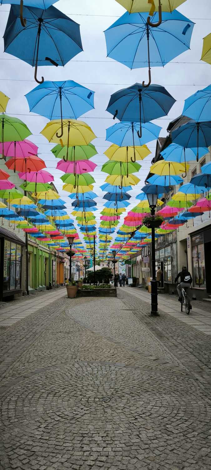 Trasa Złocieniec – Połczyn Zdrój to 35 km odcinek po dawnej linii kolejowej wybudowanej w 1903r i czynnej aż do 1991r. Następnie tory zostały rozebrane a w roku 1998 trasa odrodziła się jako droga rowerowa. Cały odcinek wiedzie nasypem przez malownicze tereny Pojezierza Drawskiego gdzie możemy podziwiać piękno otaczającej nas przyrody, bagna, rozlewiska, stawy, łąki, pola oraz wszelkiego rodzaju lasy. Musze przyznać, że pomysł na poprowadzenie trasy starotorzem jest naprawdę trafiony. Ukształtowanie terenu jest tu mocno pofalowane a nasypy kolejowe praktycznie niwelują jakiekolwiek trudy pokonania tego odcinka. Co jakiś czas przygotowane są zadaszone miejsca odpoczynku z ławeczkami i stolikami. Widać też, że trasa jest na bieżąco pielęgnowana i naprawiana. Pomimo upływu lat wciąż można natknąć się na ślady kolejowej infrastruktury np.: stacje kolejowe (niektóre zaadoptowane na przytulne i klimatyczne pensjonaty), wiadukty czy przejazdy kolejowe. Na tym odcinku napotykamy grupkę innych rowerzystów, którzy tak jak my podążają nad morze. Pozdrawiamy się wzajemnie i wymieniamy spostrzeżenia na temat przebytego odcinka. Na obiad postanawiamy zjechać do Połczyna Zdrój nie tylko z faktu, że to już pora ale również jesteśmy zaciekawieni słynnymi parasolkami na ul. Grunwaldzkiej.